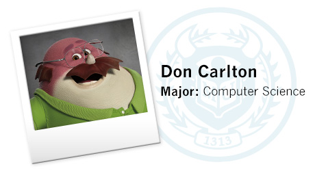 Tough economic times recently left Don looking for new employment. He studied his options and didn’t see many positive outcomes of simply finding another sales job. Don applied to Monsters University because as he explains, “When I was young I had this crazy dream of becoming a Scarer, so I figured what the heck, why not go back to school and give it a try! Sorry, I didn’t mean to swear.”