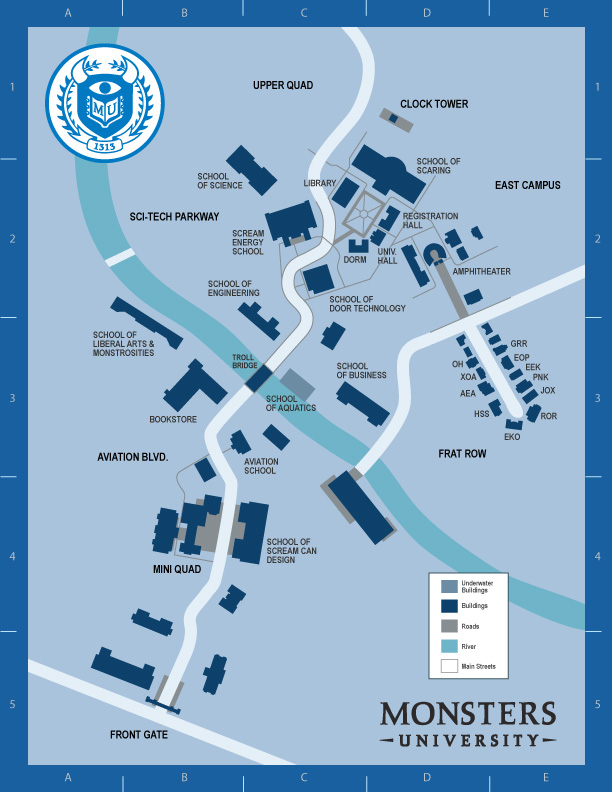 Famously located near Monstropolis, Monsters University appears on every local map. Click here for a detailed map of the campus.